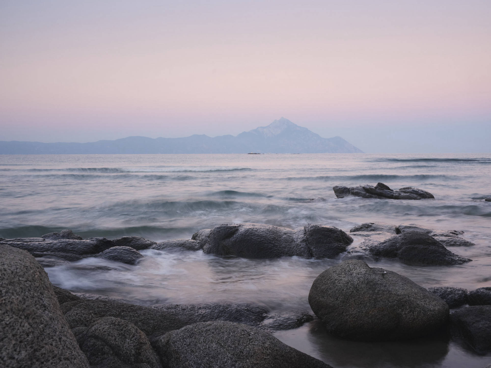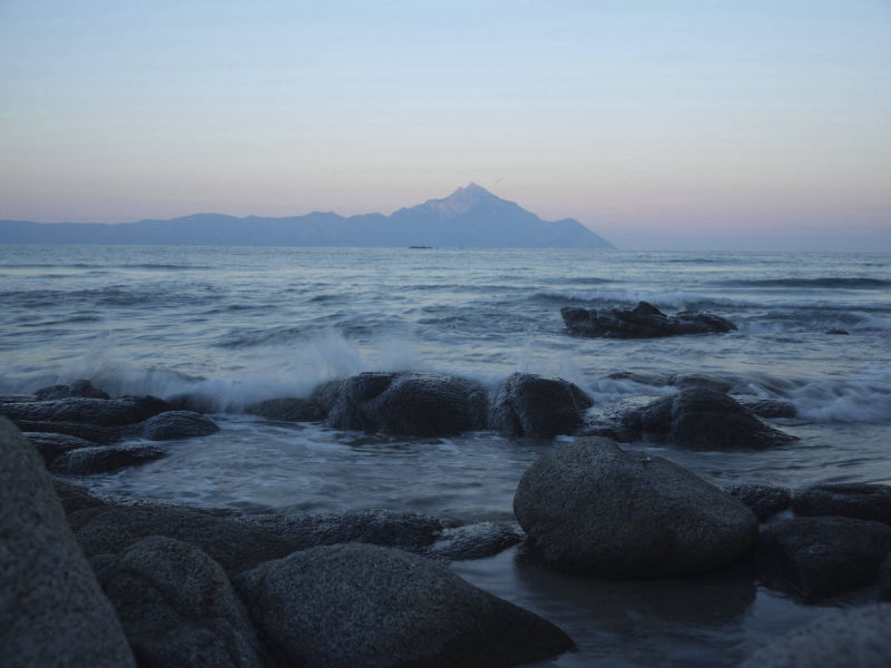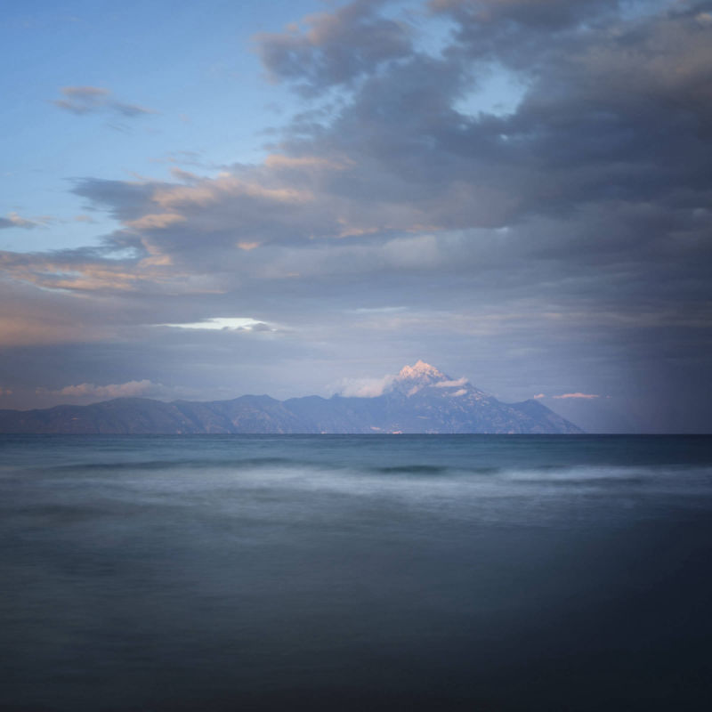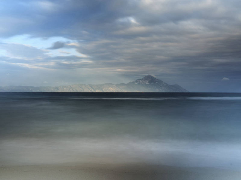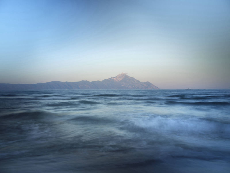 Sie zeigen den Berg Athos vom gegenüberliegenden Ort Sarti aus. Athos bedeutet „heiliger Berg". Er befindet sich auf der griechischen Halbinsel Chalkidiki.