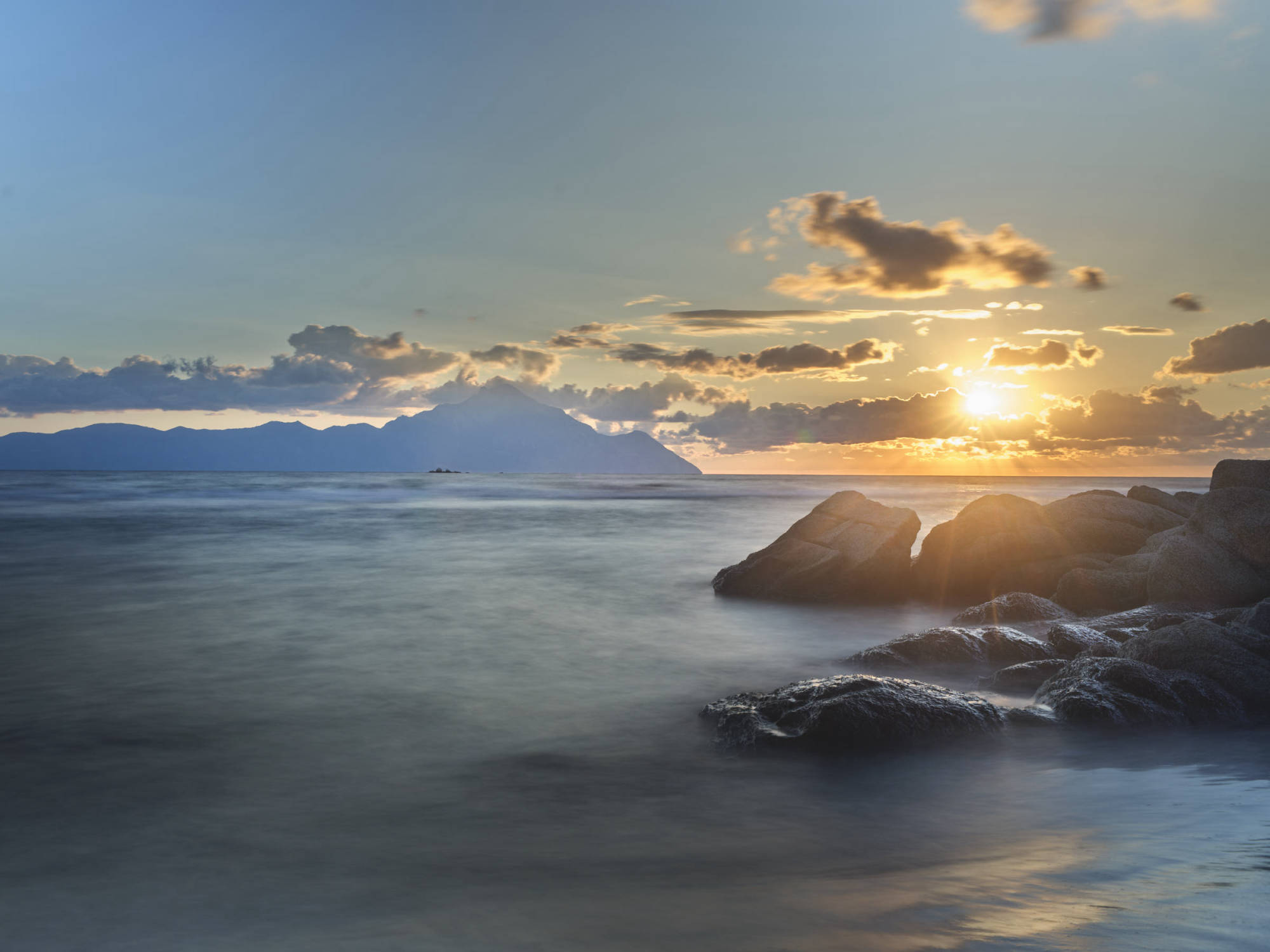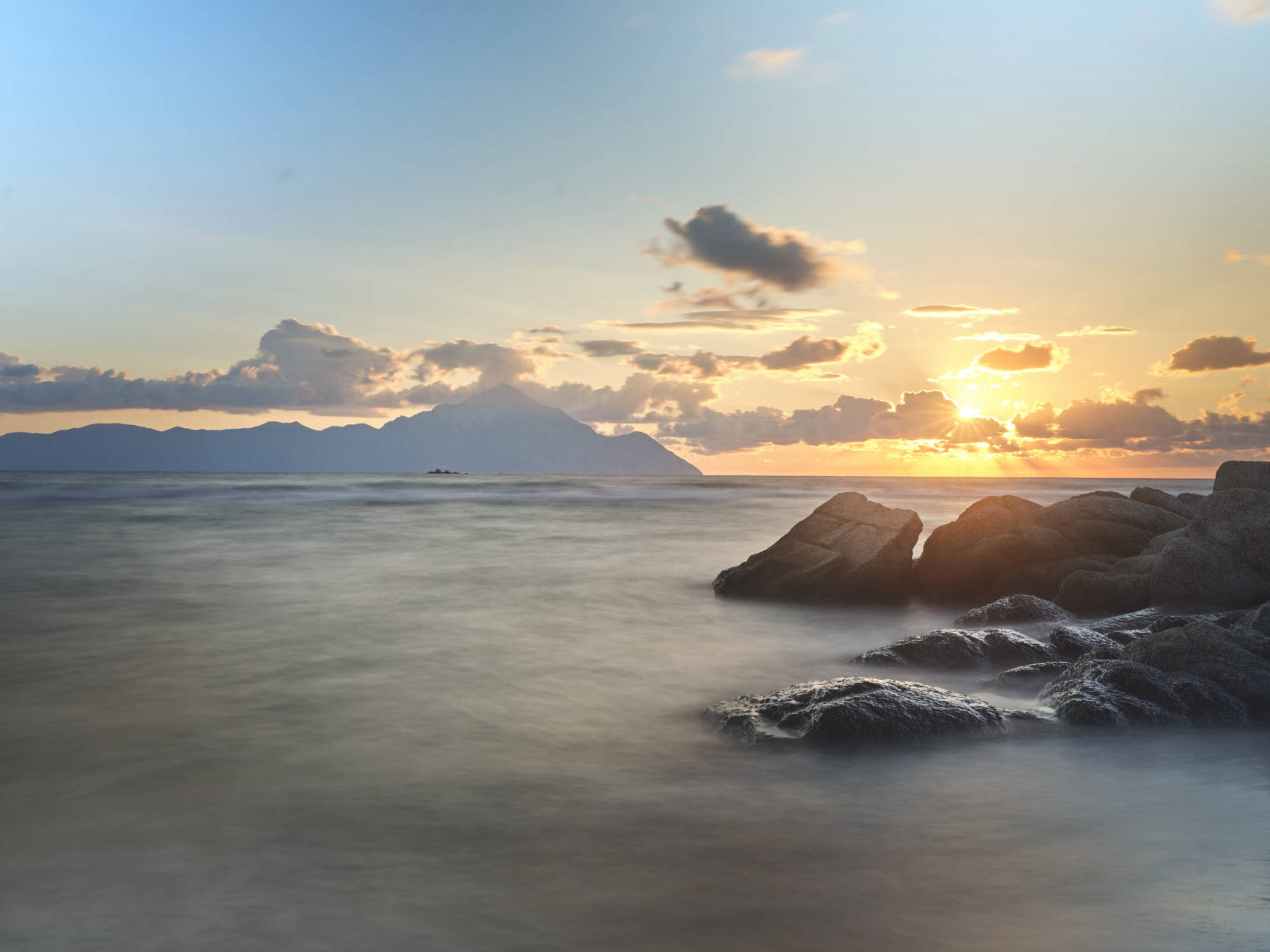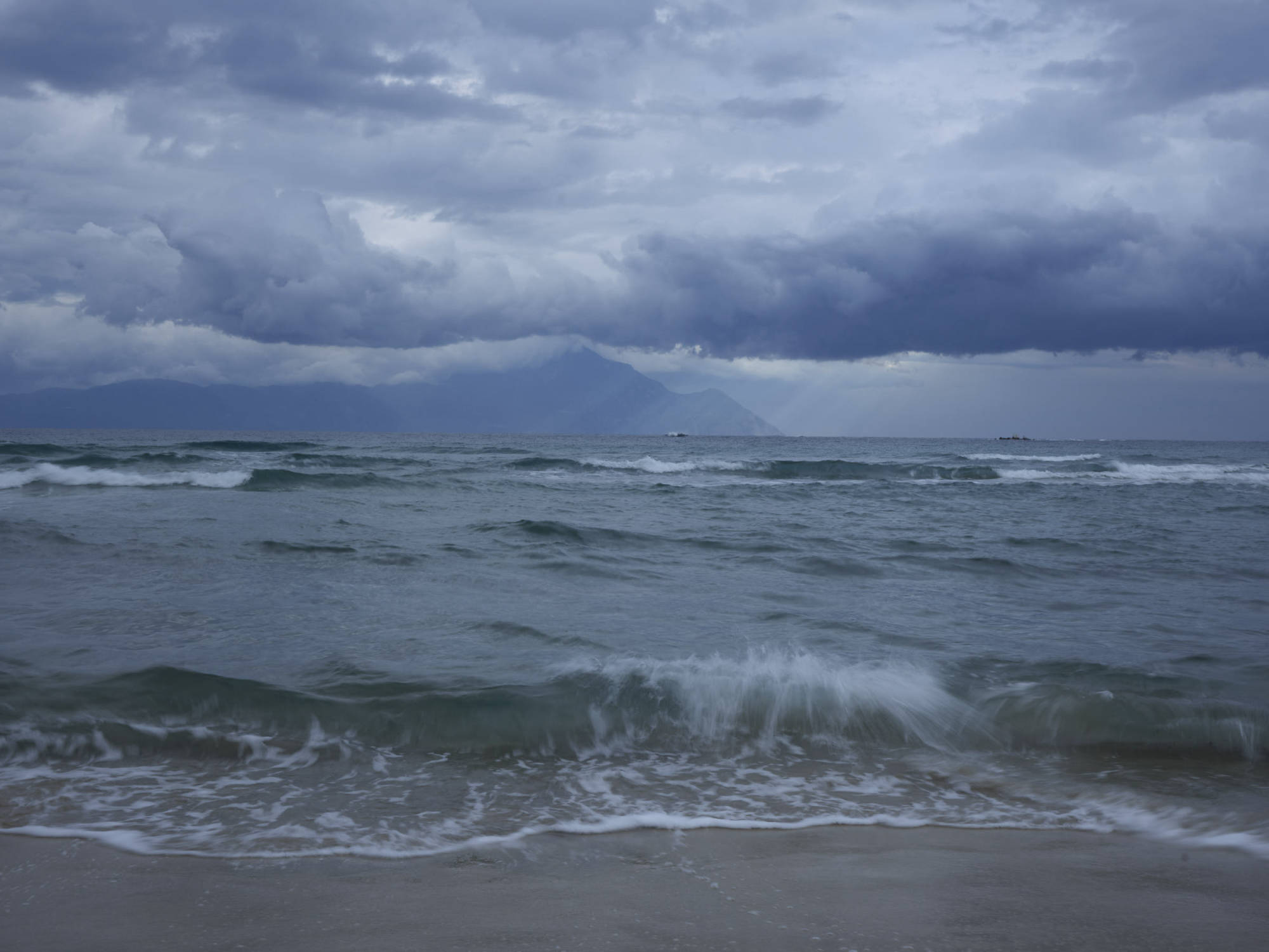 Sie zeigen den Berg Athos vom gegenüberliegenden Ort Sarti aus. Athos bedeutet „heiliger Berg". Er befindet sich auf der griechischen Halbinsel Chalkidiki.